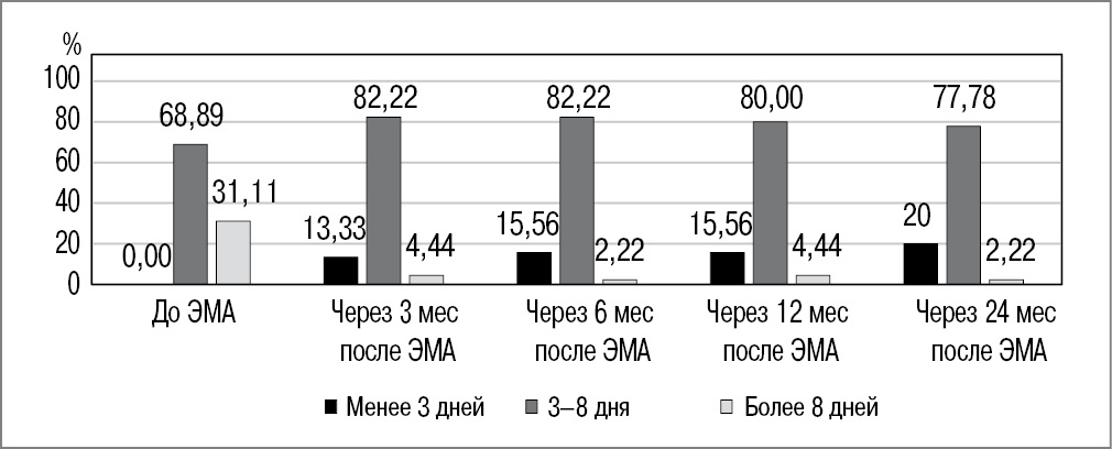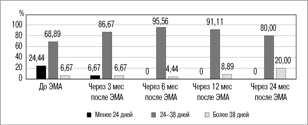 Через 24 мес после ЭМА стало больше женщин с длительностью менструации менее 3 дней (χ2=10,385; p=0,035) и меньше – с менструациями более 8 дней (χ2=34,573; p<0,001); рис. 2.