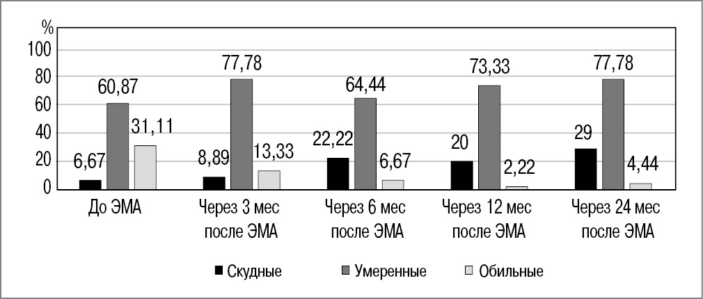 Через 24 мес после ЭМА стало больше женщин с длительностью менструации менее 3 дней (χ2=10,385; p=0,035) и меньше – с менструациями более 8 дней (χ2=34,573; p<0,001). Данные результаты могут свидетельствовать о снижении фолликулярного резерва яичников и приводить к более ранней менопаузе женщин, находящихся в перименопаузальном периоде. Уменьшение продолжительности менструации сопоставимо с исследованиями ученых из Китая [19]. Также выявлено, что после ЭМА уменьшился объем менструальной кровопотери (p<0,05).