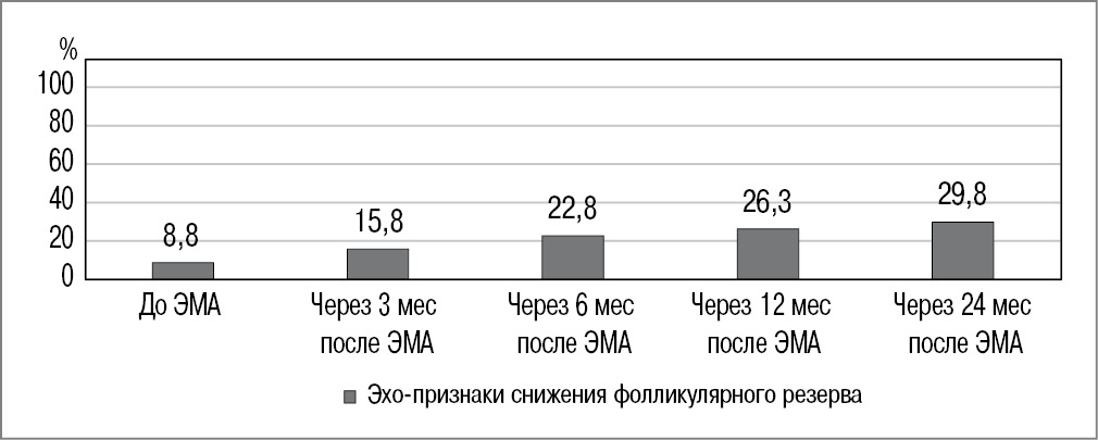 Изначально до ЭМА у 8,8% (n=5) женщин выявлены Эхо-признаки снижения фолликулярного резерва. Через 24 мес их количество увеличилось в 3,4 раза – 29,8% (n=17) (χ2=11,004; p=0,027); рис. 4.