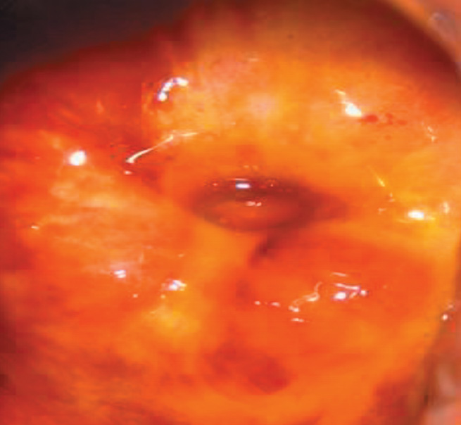 a. Кольпоскопическая картина атрофического цервицита. Кольпоскопическая картина при атрофических процессах характеризуется истончением многослойного плоского эпителия, его незрелостью. Наряду с очаговыми пятнистыми кровоизлияниями могут присутствовать и диффузные | b. Вид шейки матки на пробе с Люголем. При атрофии слизистой выраженной реакции на пробу с раствором уксусной кислоты не наблюдается, на пробе с раствором Люголя видно неравномерное окрашивание в виде отдельных пятен, при выраженной атрофии эпителий не прокрашивается | c. Вид шейки матки на пробе с раствором уксусной кислоты. При подозрении на CIN в атрофическом эпителии визуализируются атипические сосуды, грубый ацетобелый эпителий, полиморфная мозаика и пунктация |