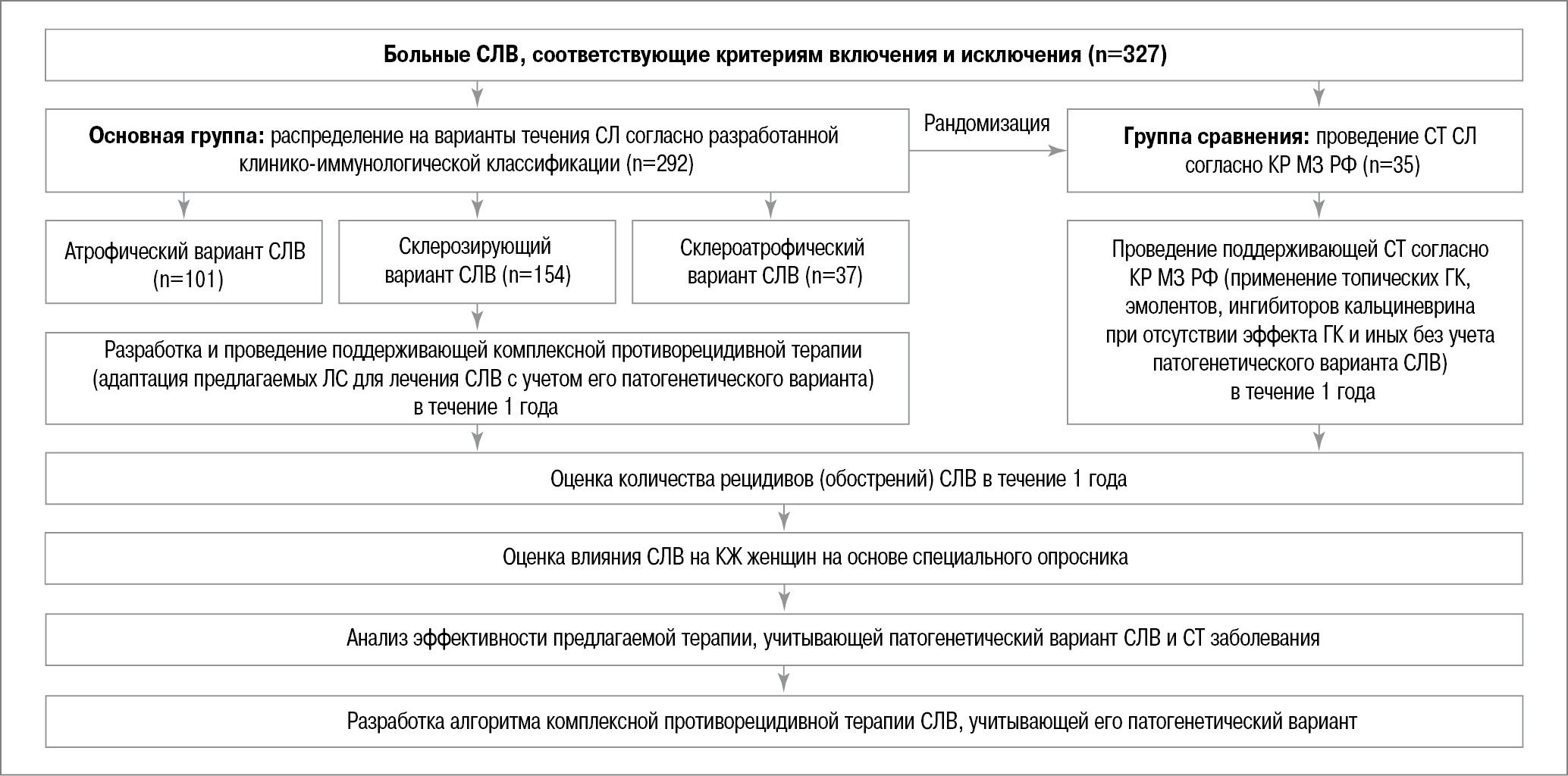 В исследовании приняли участие 327 больных СЛВ, соответствующих критериям включения и исключения, которых случайным образом распределили (методом простого случайного рандомизирования, или неограниченной рандомизации) на 2 параллельные группы: основную исследуемую группу (292 больных СЛВ, которым планировали провести терапию с учетом КИВ заболевания) и группу сравнения (35 больных СЛВ, которым планировали провести СТ СЛВ согласно КР МЗ РФ «Лишай атрофический и склеротический»). Критерии включения в исследование: возраст 20–70 лет; наличие клинически и гистологически верифицированного диагноза СЛВ; наличие информированного согласия пациенток на исследование. Критерии исключения на момент проведения исследования: наличие вирусных инфекций (вируса папилломы человека, вируса простого герпеса и иных); наличие инфекций, передаваемых половым путем; наличие острого воспалительного процесса (в том числе вульвита и вагинита); наличие онкологического процесса; наличие тяжелой декомпенсированной соматической патологии, в том числе аутоиммунной; беременность; нежелание пациентки участвовать в исследовании.