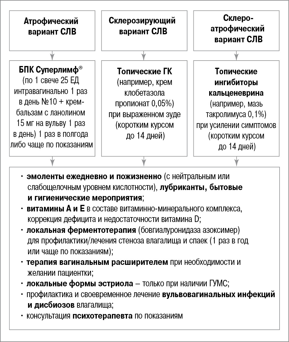 Общими для всех больных из основной группы (с любым вариантом СЛВ) стали рекомендации по ежедневному и пожизненному применению увлажняющих средств (эмолентов) и лубрикантов (при половых контактах), обязательному приему в профилактических дозах витаминов А и Е, а также коррекции выявленного дефицита витамина D. Не менее важным условием стало обязательное выполнение бытовых, гигиенических и интимных рекомендаций по уходу за вульвой: не использовать мочалки, грубые бумажные полотенца, влажные туалетные салфетки и др.; принимать душ, а не ванну, очищать вульву 1 раз в день; использовать фармацевтические средства для интимной гигиены без отдушек, для сухой и чувствительной кожи, с нейтральным или слабощелочным уровнем кислотности; исключить ношение тесного нижнего белья из синтетических тканей, с грубыми швами или кружевами, а также с узкой ластовицей («стрингов» и т.п.); спать без нижнего белья; при стирке белья использовать гипоаллергенные моющие средства; исключить бритье и другие виды депиляции волос в области вульвы, допуская их удаление только в области лобка и зоны «бикини».