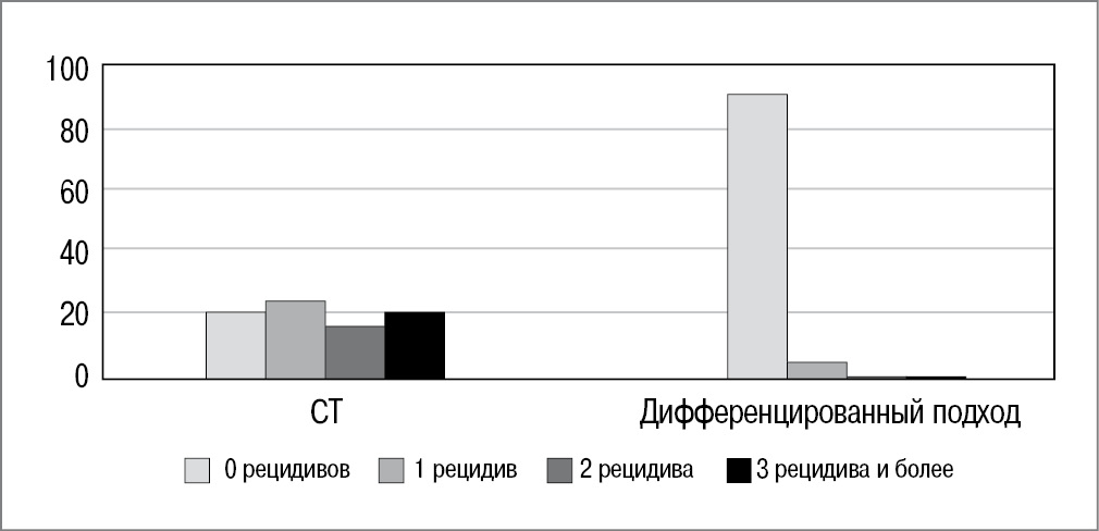 Рис. 3. Сравнительная оценка количества рецидивов СЛВ в течение 1 года у пациенток при стандартном и дифференцированном комплексном лечении, %.