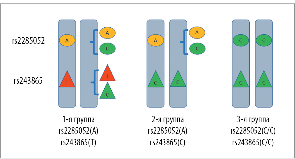 1-я группа rs2285052(A) rs243865(T) | 2-я группа rs2285052(A) rs243865(С) | 3-я группа rs2285052(C/C) rs243865(C/C) | ||||