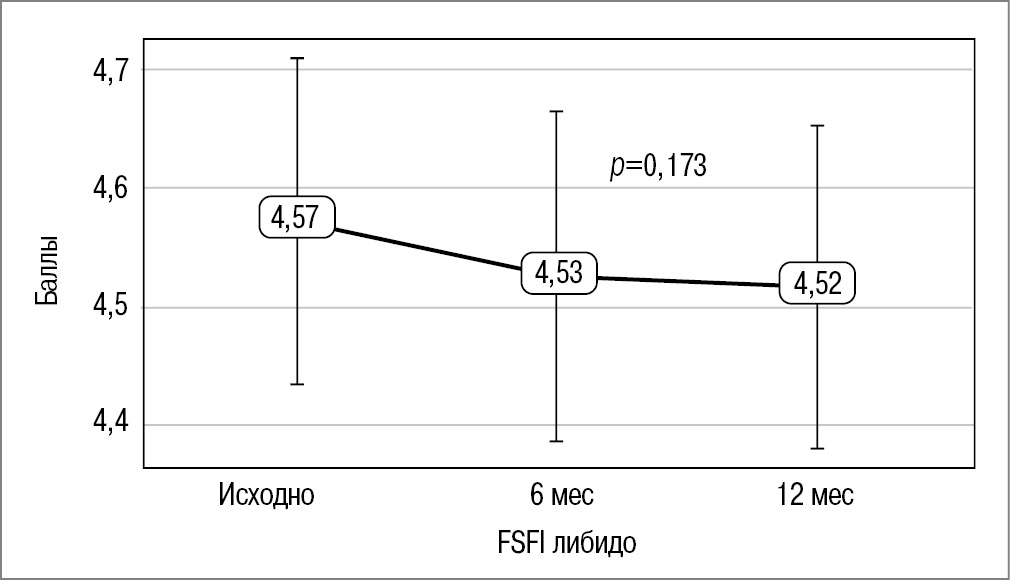 Основная задача исследования – оценка изменений сексуальной функции пациенток, для чего провели анализ динамики суммы баллов по шкале FSFI (рис. 1). В ходе анализа динамики общего балла FSFI статистически значимых изменений этого показателя установить не удалось ни через 6, ни через 12 мес от начала приема КОК, содержащего 15 мг эстетрола и 3 мг дроспиренона (p=0,867).