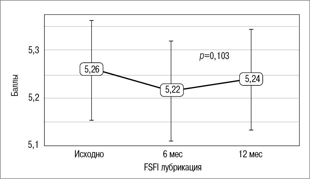 В целях исключения значимых изменений по отдельным показателям шкалы FSFI осуществили оценку наиболее уязвимых к приему КОК дескрипторов (либидо и лубрикация). В ходе исследования статистически значимых изменений дескриптора FSFI «либидо» не установлено; p=0,173 (рис. 2). Общая динамика не демонстрирует значимого снижения баллов FSFI в дескрипторе «либидо» (p=0,173), что свидетельствует об отсутствии негативного влияния изучаемого КОК на сексуальное желание женщин, его принимавших. В результате анализа не удалось установить статистически значимых изменений баллов по шкале FSFI дескриптора «лубрикация»; p=0,103 (рис. 3).