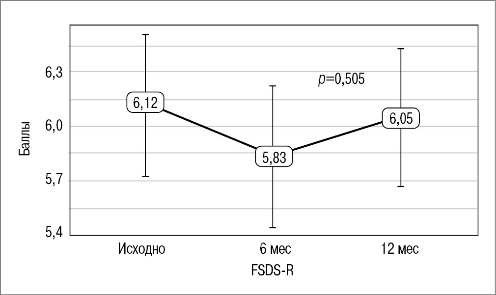 FSDS-R, баллы  | 5,83±3,17  | 5,73–6,51  | 0,910  |
