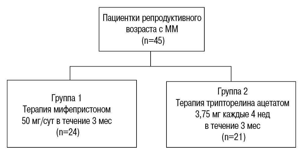 В пилотное проспективное рандомизированное исследование включены 45 пациенток репродуктивного возраста (от 18 до 40 лет) с установленным диагнозом ММ. Все женщины подписали информированное добровольное согласие, произведено изучение клинико-анамнестических особенностей, определено состояние репродуктивной функции.