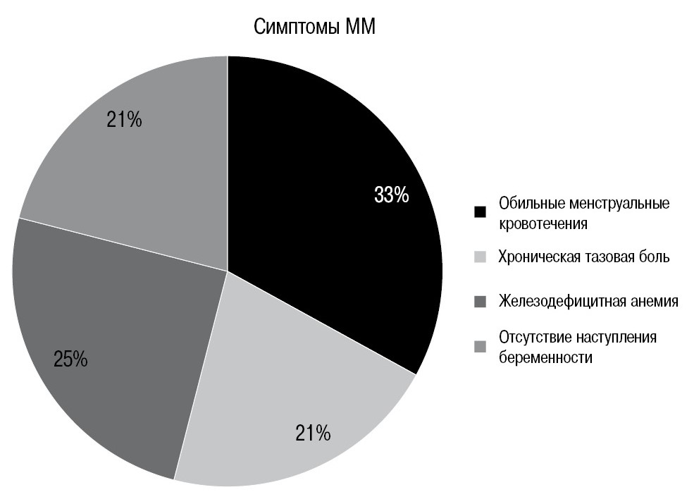 При оценке клинической картины у 33,3% пациенток наблюдались жалобы на обильные менструальные кровотечения, у 20,8% – на хроническую тазовую боль, у 25% – на железодефицитную анемию, у 20,9% женщин основной жалобой явилось отсутствие наступления беременности (рис. 2).