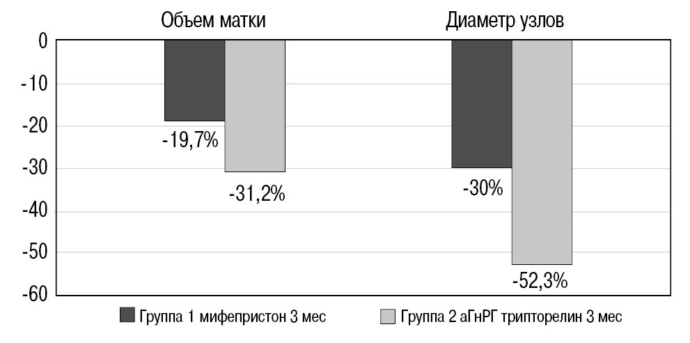 При анализе динамики изменения объема матки и диаметра максимального узла выявлено, что при применении аГнРГ эти параметры уменьшаются в среднем на 31,2 и 52,3% соответственно, что приводит к более быстрому купированию симптомов ММ, уменьшению объема кровопотери и восстановлению уровня гемоглобина. В первой группе пациенток с применением мифепристона эти значения были меньше и составили 19,7 и 30% (рис. 5). Однако при статистическом анализе купирования симптомов достоверных различий между группами не выявлено, что позволяет сделать вывод об эффективности проведения гормональной терапии ММ.