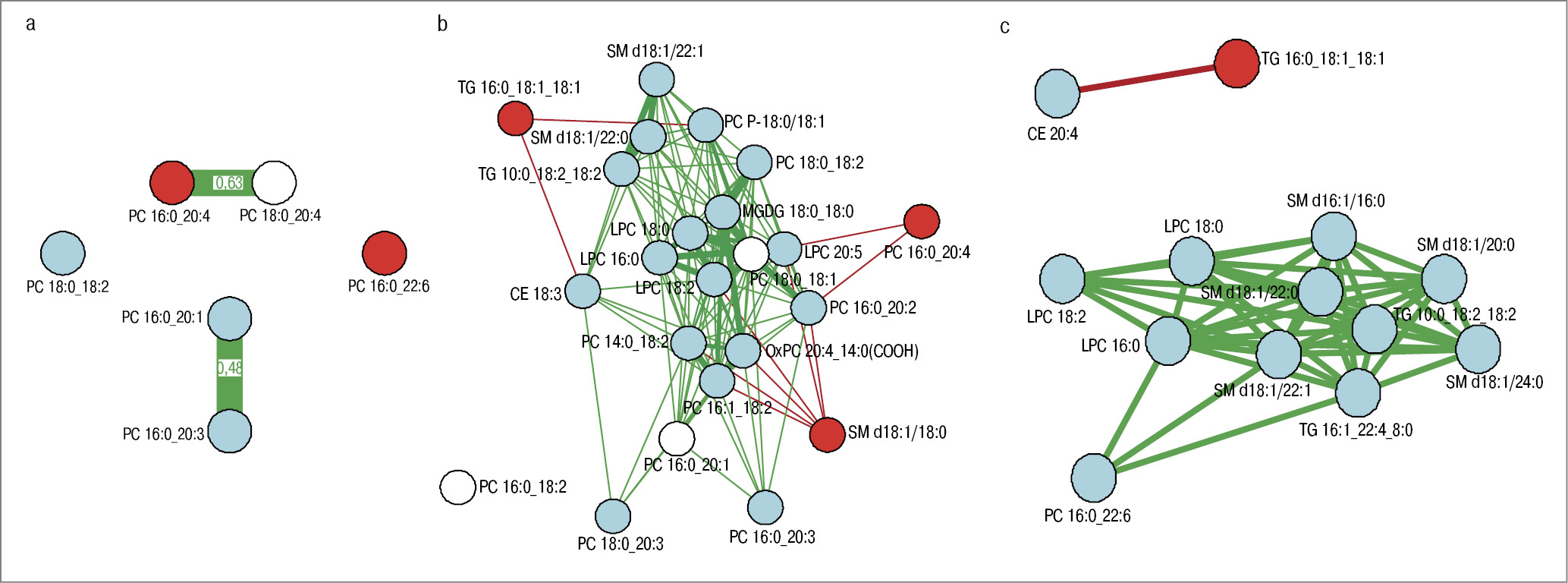 Рис. 2. Граф корреляционного взаимодействия маркеров, выбранных с использованием PLS при сравнении групп: а – группа контроля/ДОЯ; b – группа контроля/ЗОЯ; c – ДОЯ/ЗОЯ. Красными кругами обозначены соединения, уровень которых повышается при ЗНО, синими – снижается, белыми – изменений не обнаружено. Красными линиями выделены отрицательные связи, зелеными – положительные.