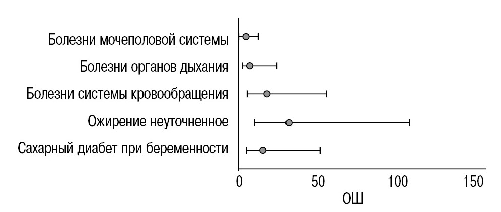 Результаты. Тяжелое течение COVID-19 у беременных определяет высокую вероятность плацентарных нарушений (отношение шансов – ОШ 6,1; 95% доверительный интервал – ДИ 2,6–14,9), задержки роста плода (ОШ 5,6; 95% ДИ 1,2–30,2), преэклампсии (ОШ 8,5; 95% ДИ 3,4–22,4), преждевременных родов (ОШ 14,1; 95% ДИ 5,8–38,4), оперативного родоразрешения (ОШ 8,5; 95% ДИ 4,1–18,1), низкой МТ детей при рождении (ОШ 18,0; 95% ДИ 6,4–62,2), госпитализации в отделение реанимации и интенсивной терапии новорожденных (ОШ 25,4; 95% ДИ 6,4–67,0).