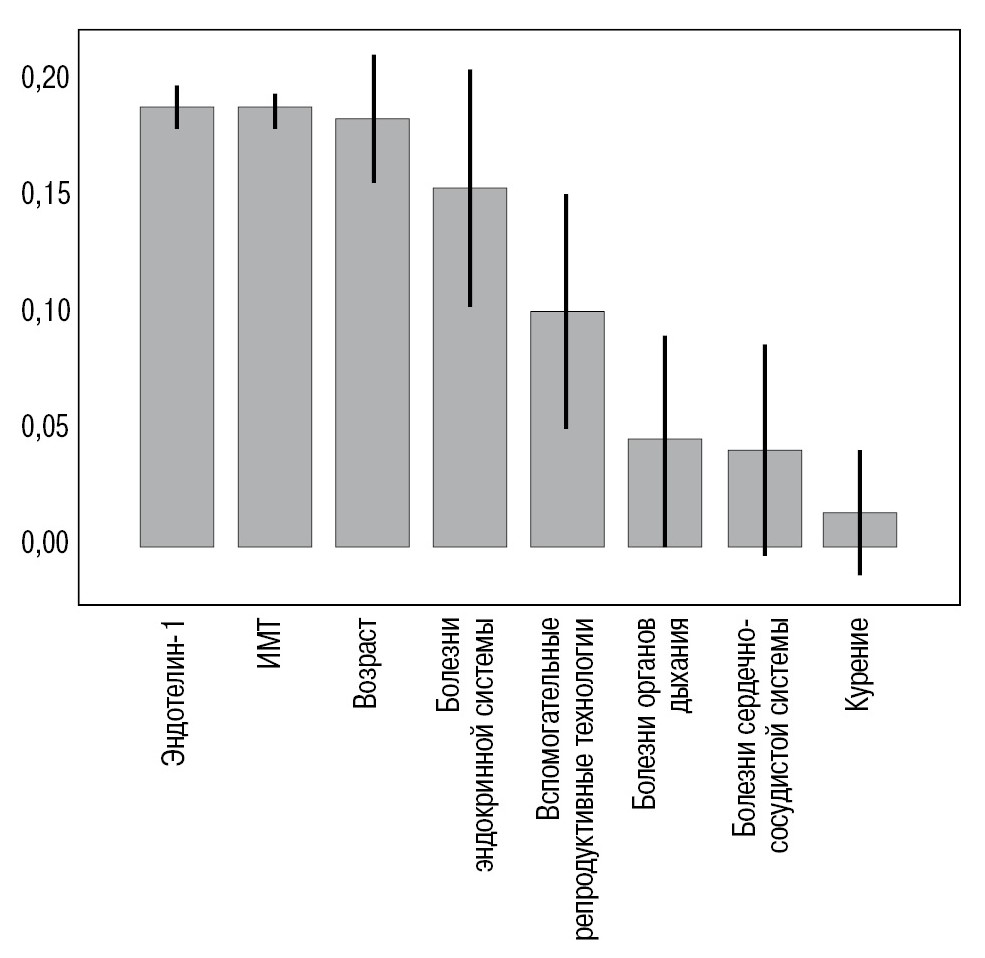 Рис. 3. Значение изучаемых факторов при прогнозировании акушерского риска у беременных с COVID-19. «Метод взаимной информации».