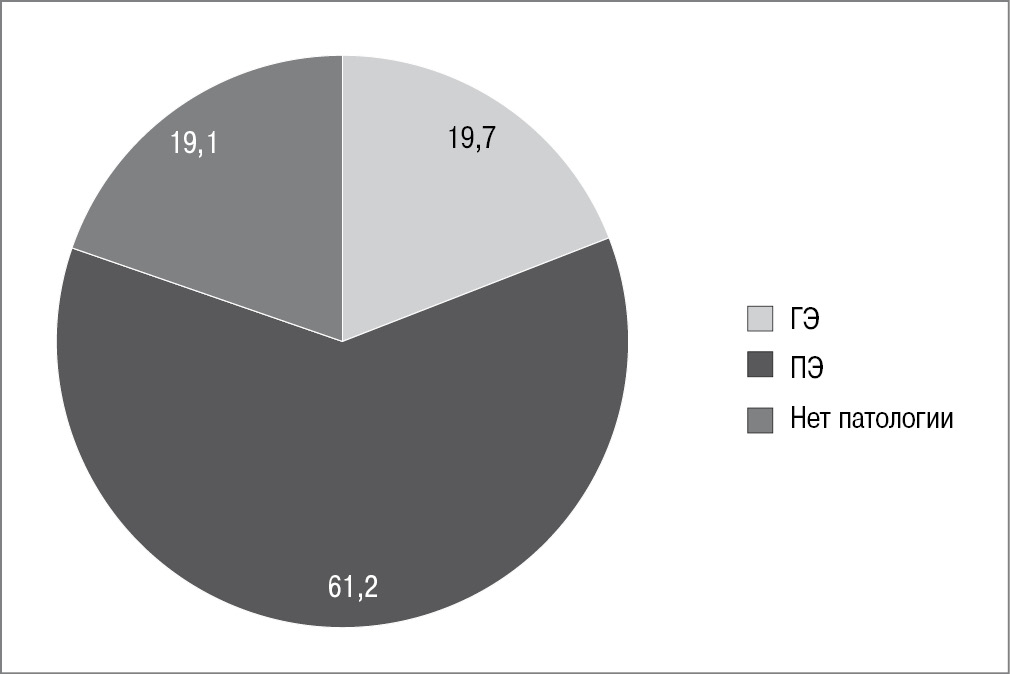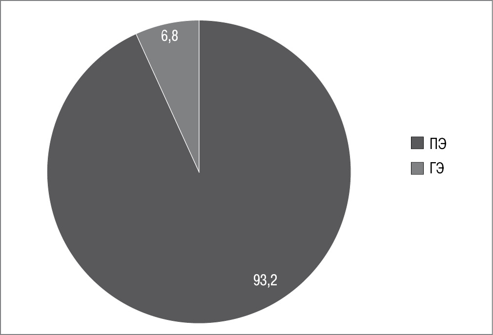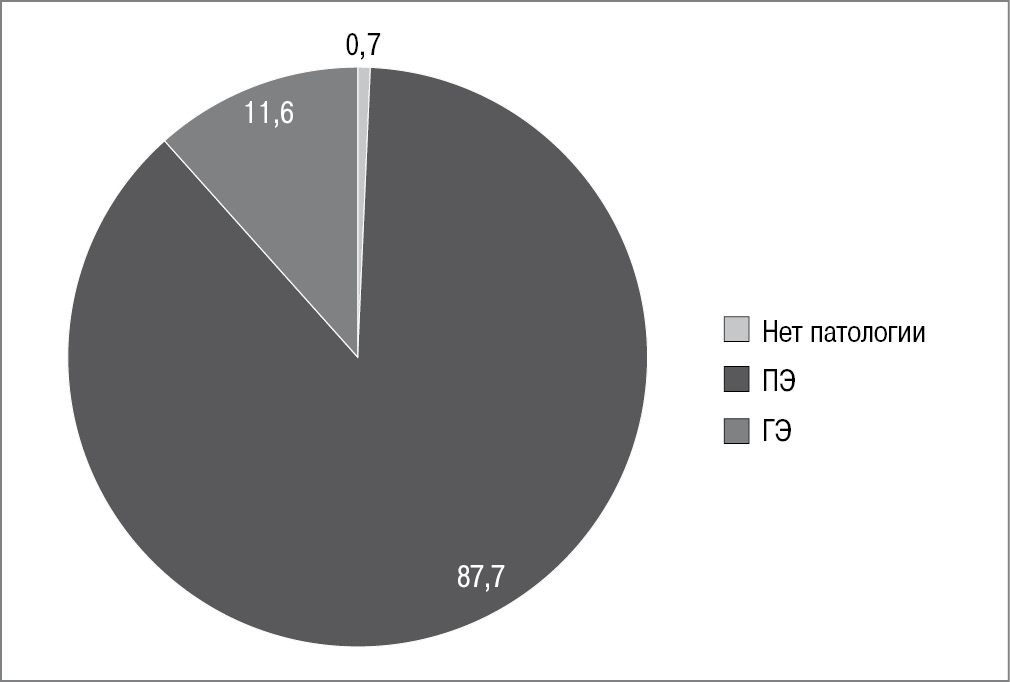ПЭ не выявлен только у 1 (0,7%) пациентки, вероятная ГЭ – у 17 (11,6%), правильно поставлен диагноз ПЭ у 129 (87,7%).