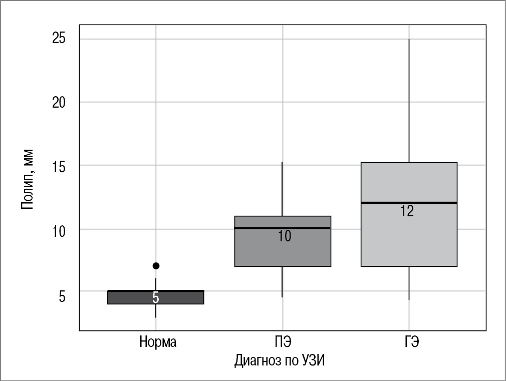 Выполнен анализ точности постановки диагноза по результатам УЗИ ОМТ в зависимости от размера ПЭ (табл. 1); выявлены статистически значимые различия в уровне точности диагностики. При полипах меньше 5 мм есть статистически значимая вероятность не диагностировать его. При полипах больших размеров есть риск диагностики другой внутриматочной патологии − ГЭ (рис. 2).
