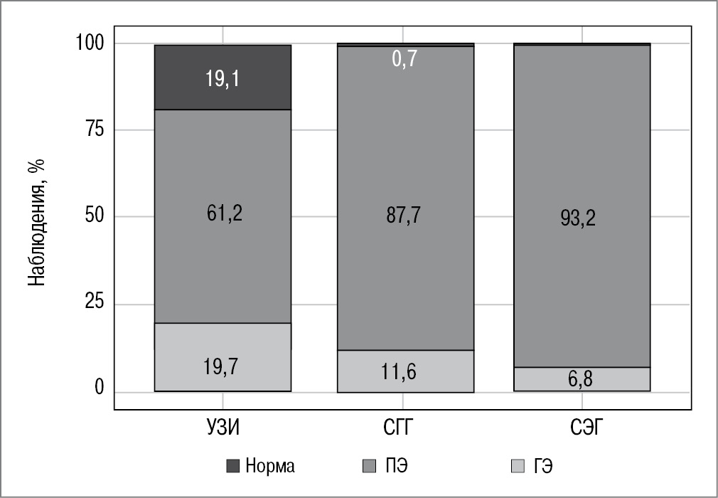 Информативность СЭГ в диагностике ПЭ. Результаты этого метода исследования представлены на рис. 4. При проведении СЭГ ПЭ выявлен у 137 (93,2%) пациенток, подозрение на ГЭ − у 10 (6,8%) пациенток. Таким образом, частота диагностирования ПЭ по результатам СЭГ по сравнению с УЗИ ОМТ значительно возросла: ОШ 8,7 [4, 2; 17, 9]. Важно подчеркнуть, что СЭГ относится к неинвазивным методам: он может помочь избежать проведения внутриматочной манипуляции СГГ: ОШ 1,9 [0, 8; 4, 2]; рис. 5.