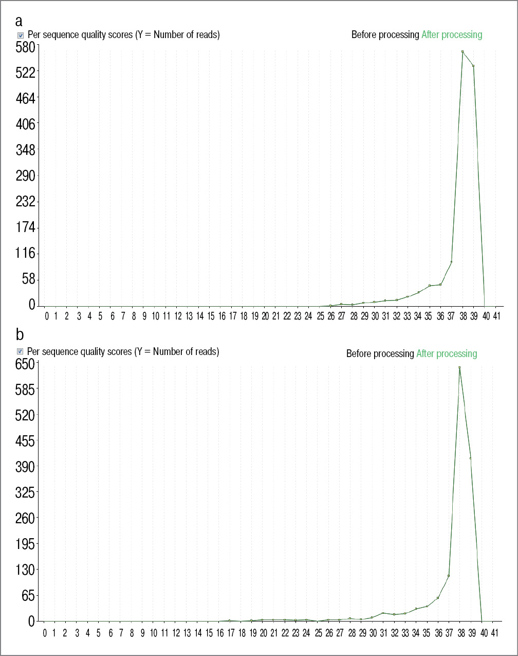 Figure 1. Assessment of the quality of reading the forward (a) and reverse (b) DNA sequences of exon 10 (1540-1664 bp) and part of exon 21 (3030-3185 bp) of the PIK3CA gene (x - average reading quality, y - number of reads; performed using NextGen Sequence Workbench)