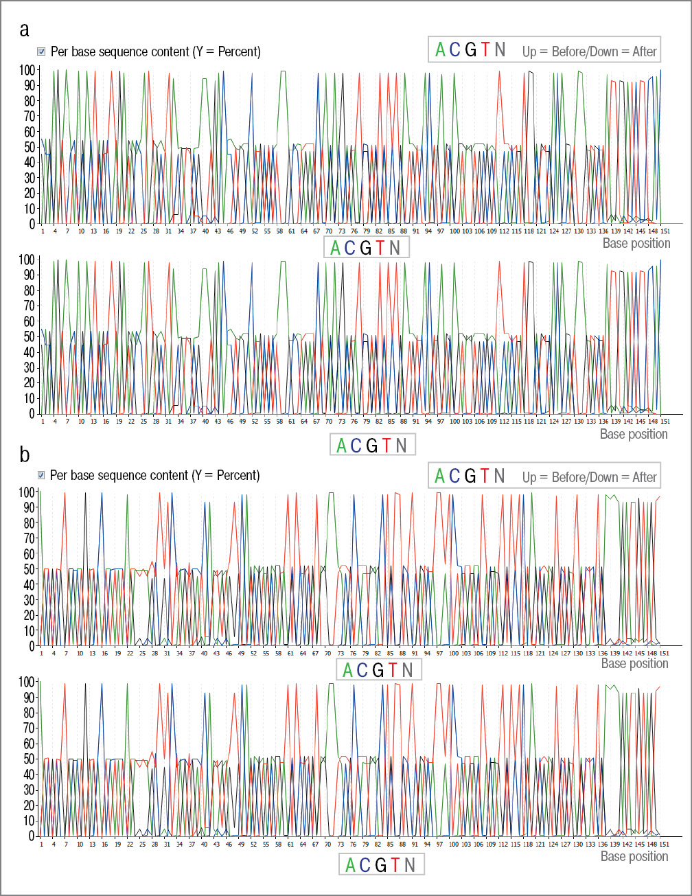 Figure 2. Basic content of the forward (a) and reverse (b) DNA sequences of exon 10 (1540-1664 bp) and part of exon 21 (3030-3185 bp) of the PIK3CA gene (performed using the NextGen Sequence Workbench program)