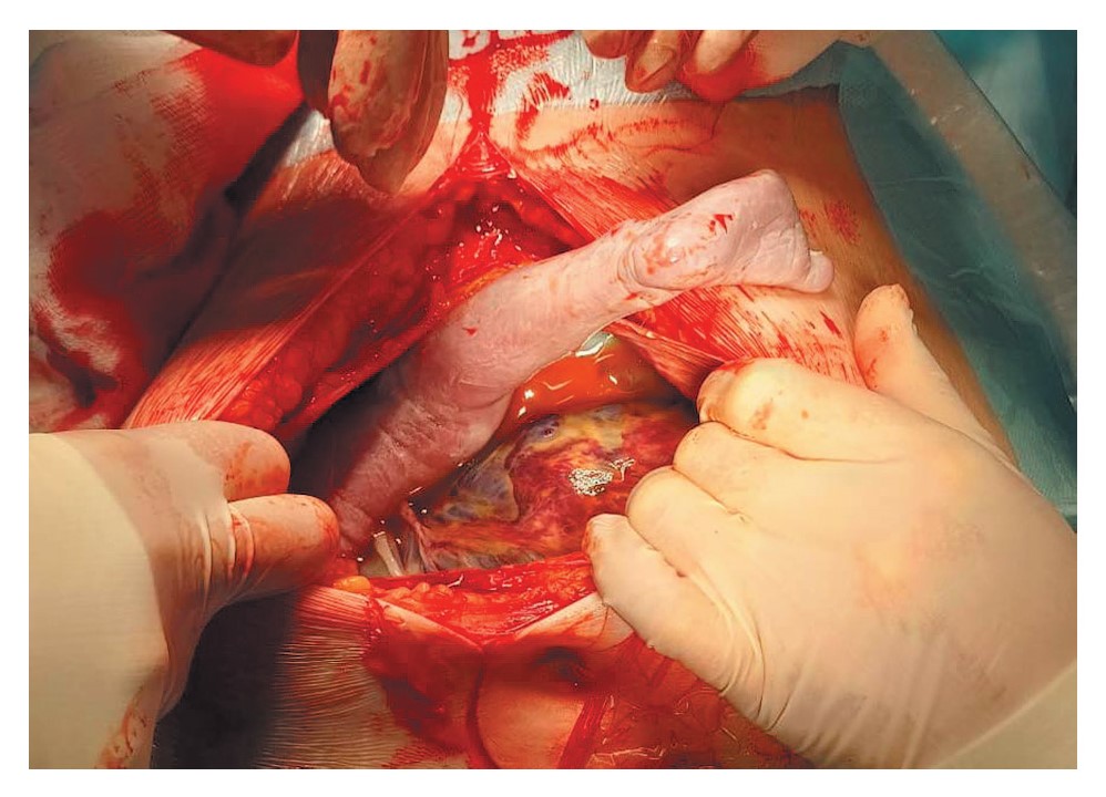Исходя из абсолютного маловодия, предлежания и врастания плаценты, некупируемых ноющих болей в животе при сроке беременности 33–34 нед [22] коллегиально в условиях информированного согласия пациентки принято решение о родоразрешении операцией кесарева сечения в порядке срочности. Согласно клиническим рекомендациям «Патологическое прикрепление плаценты (предлежание и врастание плаценты)» (2023 г.) в условиях соблюдения принципа хирургической безопасности и готовности к применению кровесберегающих технологий (заявка на реинфузию, готовность Cell Saver, оповещение трансфузиолога) выполнена нижнесрединная лапаротомия [22]. При вскрытии брюшной полости (БП) вскрылся плодный пузырь, который интимно прилежал к брюшине (рис. 1). За предлежащие к ране ножки плода без технических трудностей извлечена живая девочка с признаками недоношенности c оценкой по шкале Апгар 6 и 7 баллов на 1 и 5-й мин соответственно, массой 2190 г и длиной тела 43 см.