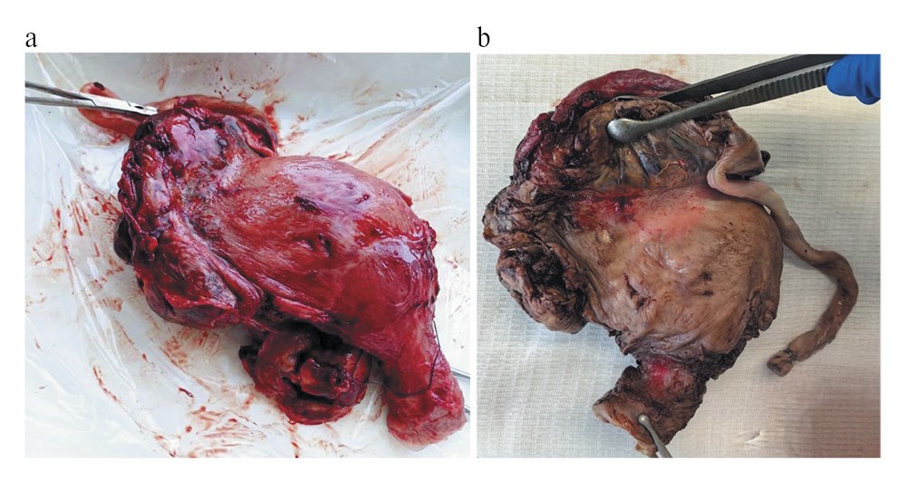 Fig. 2. Gross specimen of the uterus with ingrown placenta: a – surgical specimen; b – after fixation: ectopic pregnancy in abdominal cavity; implantation in the fundus and right corner of the uterus; the umbilical cord extends from the central part of the placenta.