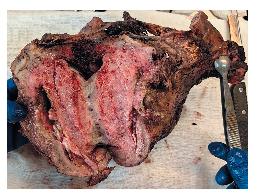 Fig. 3. Gross specimen of the uterus (cross-section): The uterus is of the correct shape (no congenital abnormalities of the uterus were found); there is a placenta ingrowth into the myometrium.