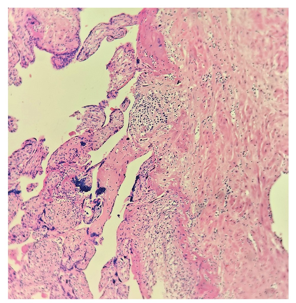 Гистологическое заключение по матке: в области патологической имплантации определяется широкая зона фибриноидного некроза с вовлечением сосудов и мышечной ткани, плацентарная ткань в большом количестве пенетрирует мышечные волокна, подрастая на отдельных участках к эндометрию, часть ворсин замурована в большое количество фибрина (рис. 5). Перифокально отмечается лимфоидно-лейкоцитарная реактивная инфильтрация, кровоизлияния. Эндометрий с десквамацией, железы и строма с неполноценной гравидарной трансформацией, очаговой лимфоидно-лейкоцитарной инфильтрацией. Мышечные волокна миометрия неравномерно гипертрофированы, с умеренно выраженными дистрофическими изменениями миоцитов и резко выраженным интерстициальным отеком, разрастанием соединительной ткани между волокнами. Сосуды с утолщенной фиброзированной стенкой. Серозная оболочка отечная, с мелкоочаговыми кровоизлияниями. Патоморфологический диагноз: ЭБ (34+4 нед гестации по клиническим данным) с локализацией в БП, имплантацией в области дна и правого угла матки, гистопатические изменения миометрия.