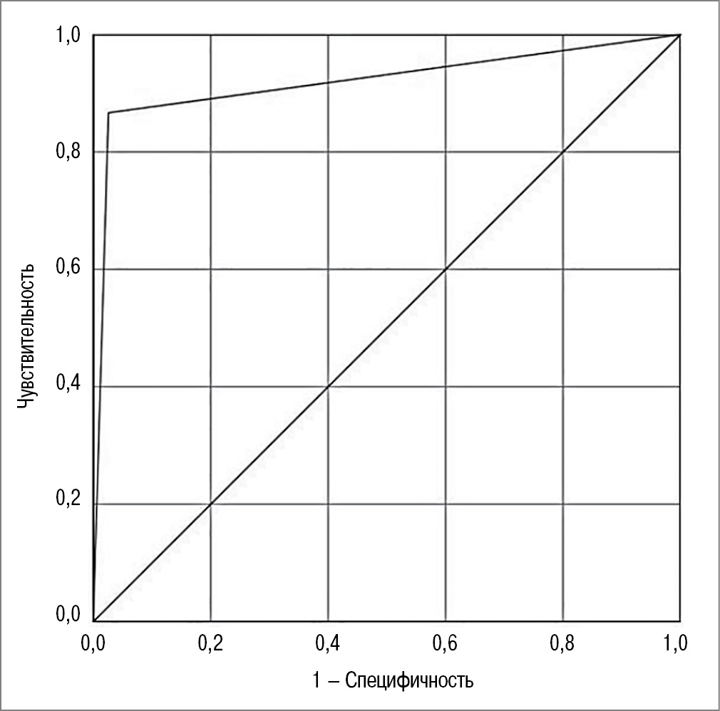 У 50 пациенток контрольной группы прогноз оказался отрицательным, что составило 98,0% (50/51), у 42 пациенток основной группы – положительным: 87,5% (42/48). Точность прогноза – 92,9%. Наряду с оценкой площади под ROC-кривой (ROC-AUC=0,921±0,04 [95% ДИ 0,843–0,998]; p<0,001), это позволяет считать разработанную модель оптимальной для прогнозирования плацентарных нарушений (рис. 3).