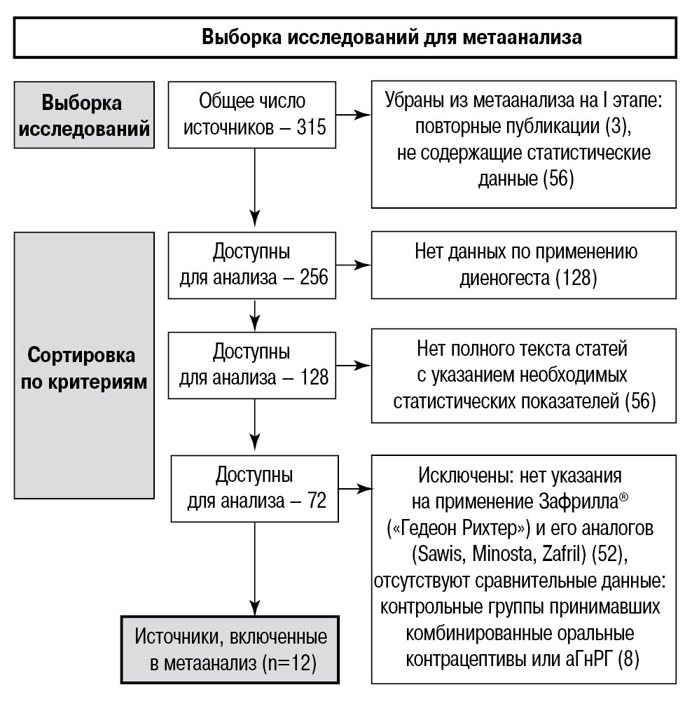 Цель исследования – провести метаанализ доступных в литературе результатов лечения болевого синдрома при эндометриозе препаратом диеногест (Зафрилла).