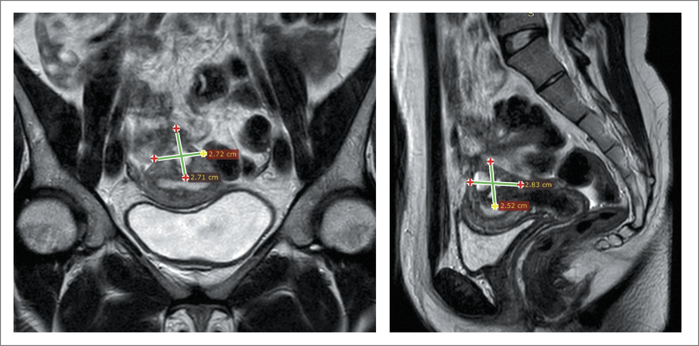 В перинатальный центр ФГБОУ ВО СПбГПМУ обратились для дистанционной консультации родители 16-летней девочки-подростка Л. Основная жалоба – сильные боли во время менструации, полностью совпадающие с днями кровотечения, без иррадиации; дисменорея началась с 14 лет с менархе, постепенно усиливалась интенсивность болевого синдрома. Менструации регулярные, нормальные по объему, по 4–5 дней, цикл 28–29 сут, межменструальных мажущих выделений пациентка не отмечала. За последние 2 года боли удавалось купировать приемом нестероидных противовоспалительных средств (кеторолак, индометацин). Ввиду развития выраженных побочных эффектов со стороны желудочно-кишечного тракта пациентка не могла принимать их более 3 сут подряд. Кроме нестероидных противовоспалительных средств никакие препараты не назначали, вопрос о гормонотерапии не рассматривался. Семейный анамнез не отягощен. Данных за наличие возможного эндометриоза у матери нет, у нее менструации безболезненные, беременность наступила самостоятельно, Б-1, Р-1. Девочка родилась доношенной, в срок 39 нед, через естественные родовые пути. Периоды неонатального и детского развития протекали без особенностей, травм и тяжелых заболеваний не было. Однако первая же пришедшая менструация оказалась очень болезненной. К гинекологу обратились только в возрасте 16 лет 7 мес, при ректальном ультразвуковом сканировании обнаружена «аномалия развития матки» (протокол в клинику СПбГПМУ не представлен). Мы рекомендовали магнитно-резонансную томографию (МРТ) органов таза для визуализации патологического процесса с учетом возможных указаний на врожденные аномалии развития полового аппарата, которая обнаружила наличие кистозного аденомиоза (рис. 1). В соответствии с критериями описания патологии тканей матки MUSA выявлены прямые признаки аденомиоза – наличие кист в миометрии, кистозное содержимое патологических очагов может быть анэхогенным, сниженной или смешанной эхогенности [8].