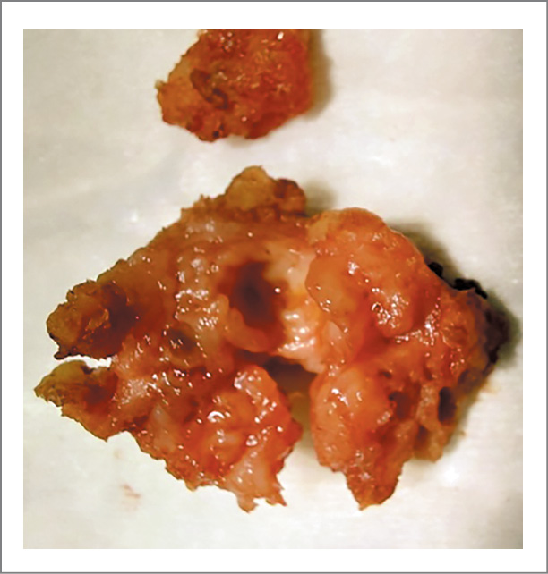 Рис. 3. Резецированная ткань аденомиомы. Видны полости, которые заполнены геморрагическим содержимым.