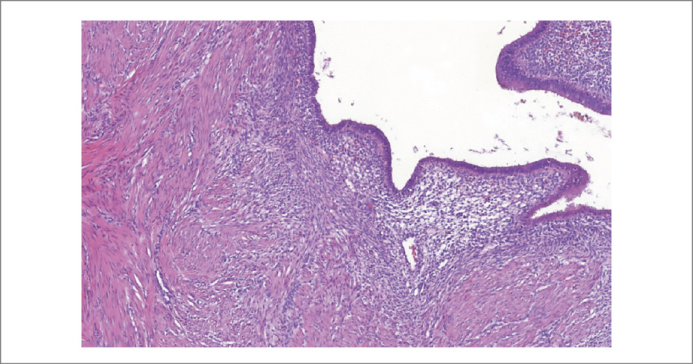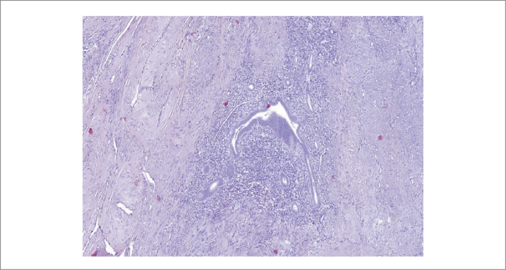 5. Fig. 4. Endometrial glands in the myometrium. Diagnosis: adenomyosis. Hematoxylin-eosin staining. ×100.