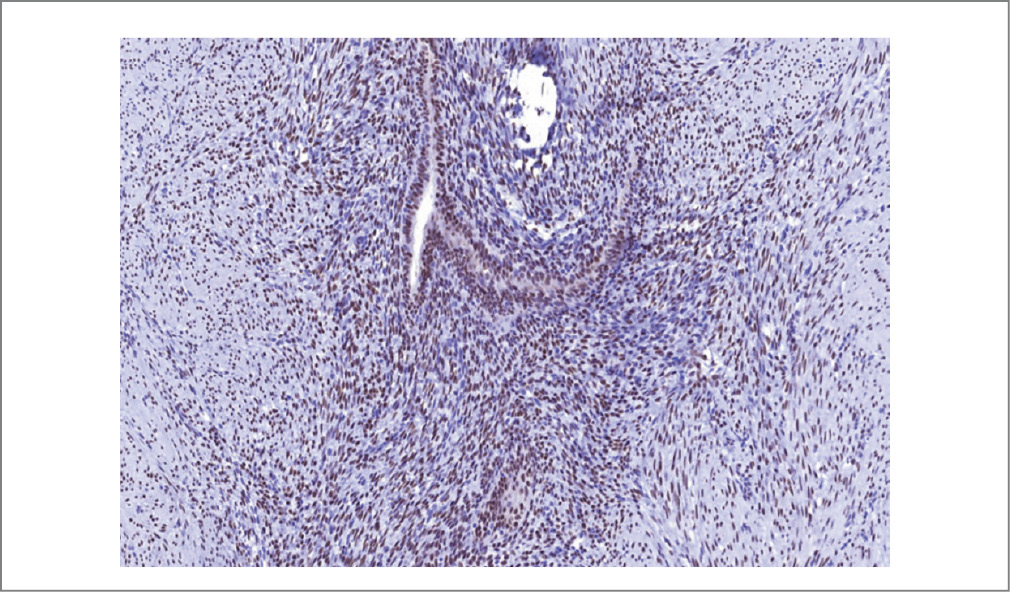 Результат патоморфологического исследования биопсийного материала (серо-розовая ткань плотно-эластичной консистенции, на разрезе белесоватого цвета, слоистого вида) представлен фрагментами новообразованной ткани, хаотично располагающимися мышечными волокнами с неравномерным разрастанием соединительной ткани, с фокусами соединительной ткани с участками, представленными эндометриоидными железами и стромой, по периферии – макрофаги, фагоцитирующие гемосидерин (рис. 3). При иммуногистохимическом исследовании выявлена умеренно выраженная экспрессия рецепторов эстрогена и прогестерона в клетках и железах эндометрия (рис. 4–8).