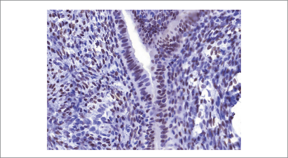 Рис. 6. Экспрессия ER в железах эндометрия. Иммуногистохимия. ×180.