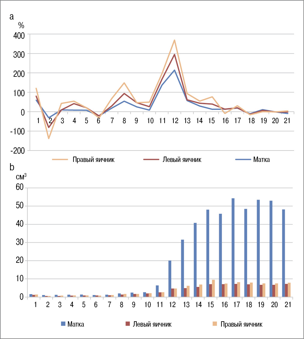 Fig. 3. The changes in volumes of the uterus and ovaries according to ultrasound by Gilligan LA (modified): a – graph of the annual increase in volumes of the uterus and ovaries from 0 to 21 years as a percentage of the previous one, demonstrates several concordant growth peaks; b – volumes of the uterus and ovaries (the same data) in absolute values (cm3).