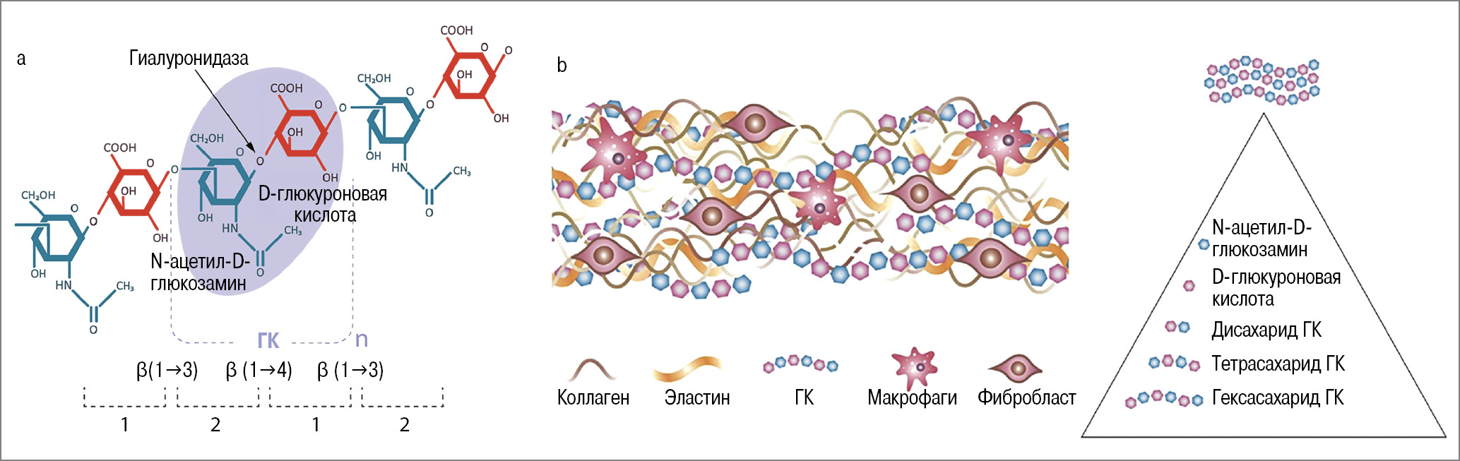 Рис. 1. Молекула ГК и точка приложения гиалуронидазы (a), расположение ГК в тканях (b).