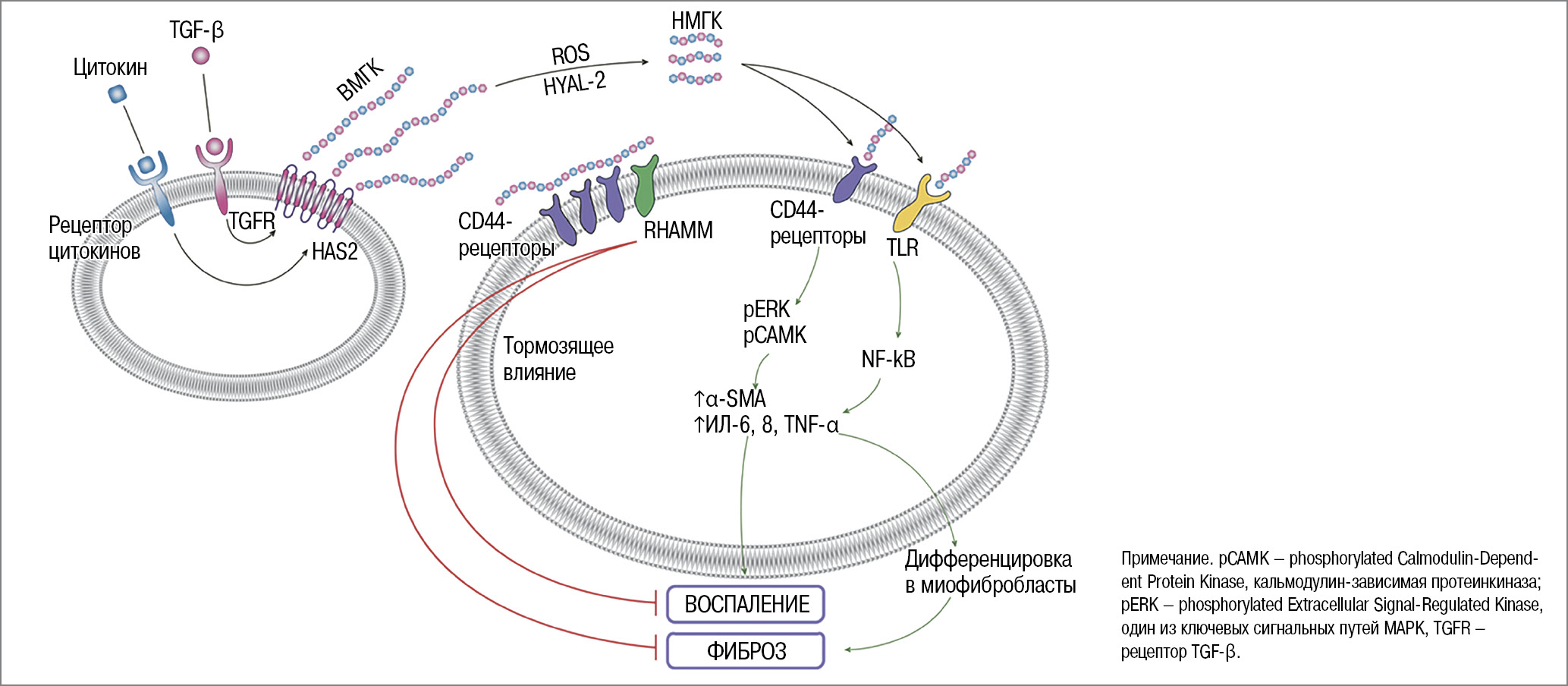 Сигнал, полученный от TGF-β и других цитокинов, влияет на экспрессию и активность гиалуронансинтазы (HAS2), производящей ВМГК, которая в условиях неэффективного воспаления (когда повреждающий фактор не элиминирован) расщепляется при участии HYAL-2 и ROS (АФК) на мелкие фрагменты НМГК. Впоследствии НМГК способна влиять на профиброзную конверсию мезотелиоцитов и связанные с ними воспалительные процессы посредством взаимодействия с рецепторами CD44 и TLR-2. Связывание НМГК с CD44 приводит к активации рERK и рCAM-киназы, которые регулируют экспрессию α-SMA и дифференцировку миофибробластов, выработку провоспалительных цитокинов. Связывание НМГК и CD44 также способствует TLR-зависимой индукции NF-kB-зависимых провоспалительных цитокинов, включая ИЛ-6, 8 и TNF-α. Минимальная длина цепи, способная вызывать провоспалительную и профибротическую активацию клеток, активировать CD44-рецепторы, – гексасахарид ГК (3 дисахарида, 6 мономеров, ММ 1,2 кДа) [13].