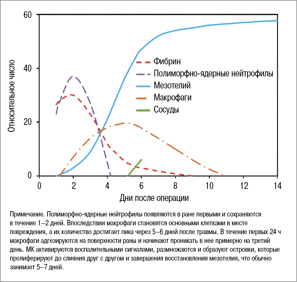 Заживление повреждений брюшины происходит в непрерывном чередовании перекрывающихся фаз – воспаления/коагуляции и фибринолиза/репарации. Результаты заживления определяются процессами синтеза, накопления, реорганизации и деградации компонентов ВКМ в месте повреждения за счет активированных МК, резидентных фибробластов и рекрутированных перицитов. Нарушение этих процессов может повлечь за собой чрезмерное спайкообразование [46].