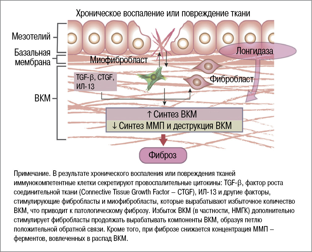 В норме при разрешении процесса воспаления НМГК подвергается деградации внутри макрофагов под действием лизосомальных ферментов. Однако при хроническом воспалении может иметь место нарушение гомеостаза ГК как важного компонента его регуляции. ГК описывается как ключевая молекула в профибротической триаде наряду с TGF-β и фибронектином [12].