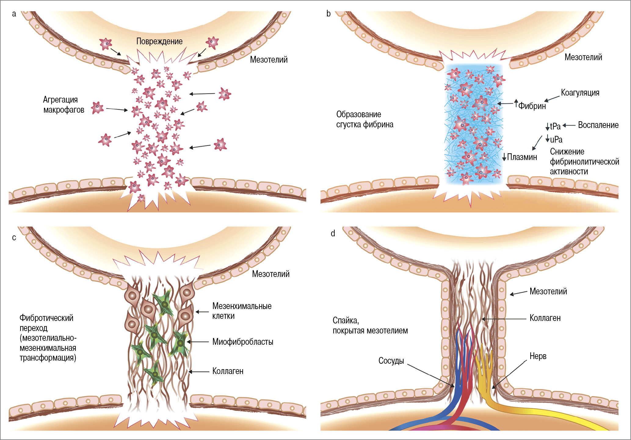 Рис. 7. Формирование послеоперационной спайки: a – повреждение мезотелия во время операции приводит к агрегации перитонеальных макрофагов в очаге и отложению фибринового сгустка; b – воспаление, коагуляция и дисфункция фибринолиза способствуют чрезмерному накоплению фибрина; c – мезотелиоциты подвергаются мезотелиально-мезенхимальному переходу с образованием миофибробластов, которые накапливаются в зоне повреждения, а также внутри фибринового сгустка и начинают интенсивно синтезировать компоненты ВКМ (коллаген, ВМГК и иные) с образованием фиброза (спаек, рубцовой ткани); d – формирование спайки завершается, когда рубцовая ткань покрывается мезотелием. Очаг поражения может стать полностью перфузированным и чувствительным к боли из-за врастания в толщу спайки кровеносных сосудов и нервов.
