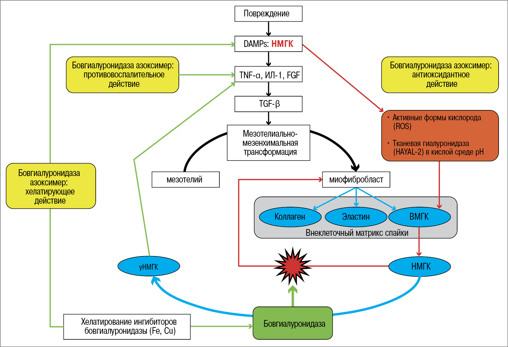 Накопление НМГК в месте повреждения приводит к незавершенному воспалению за счет активации CD44- и TLR-сигнальных путей, стимуляции NF-kB и продолжающегося высвобождения медиаторов воспаления − ИЛ-1β, 6 и TNF-α [53, 54]. Поскольку НМГК участвует в инициации воспалительной реакции, удаление НМГК из мест повреждения тканей имеет решающее значение для начала репаративного процесса [53].