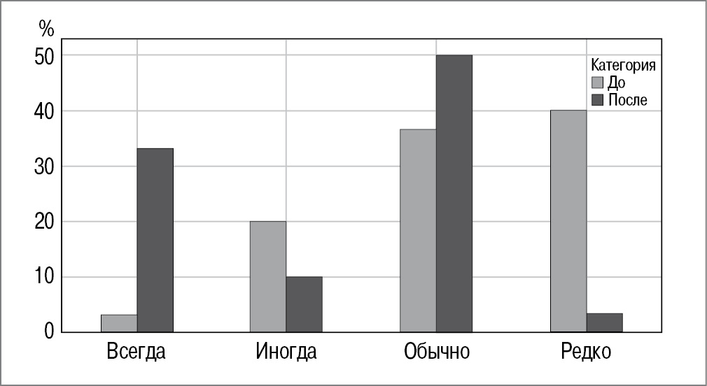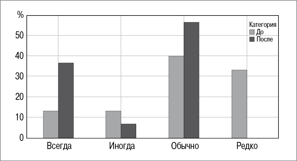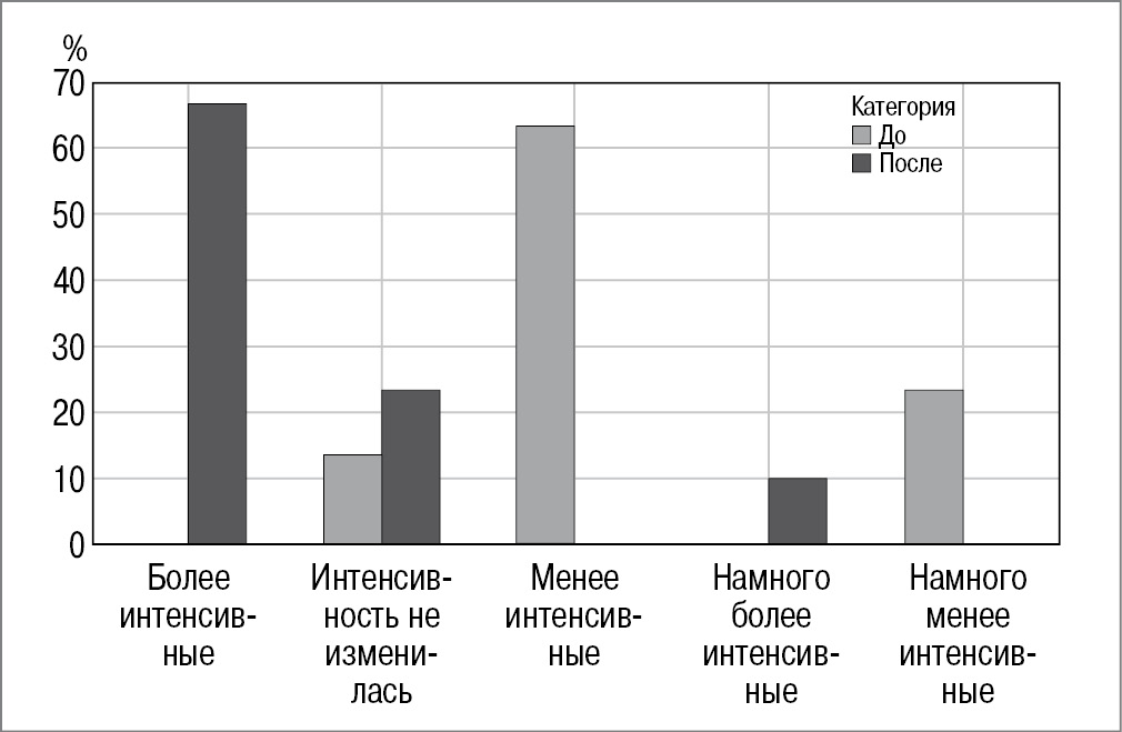 Рис. 4. Интенсивность оргазмов до и через 6 мес после контурной пластики (PISQ-12; p<0,001), %.