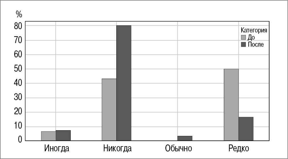 Рис. 3. Изменения частоты болевых ощущений во время полового контакта у пациенток до и через 6 мес после контурной пластики (PISQ-12; p>0,05), %.