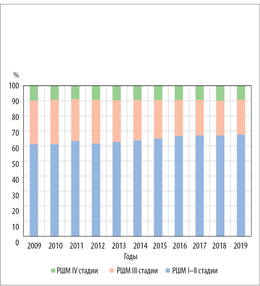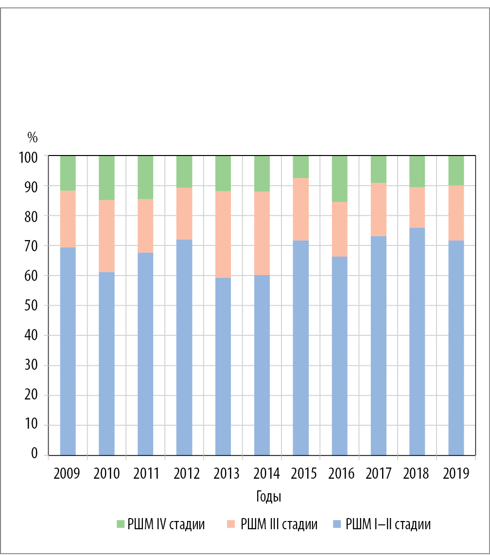 Соотношение удельного веса РШМ I–II стадии к удельной доле рака III–IV стадии в РФ в 2019 г. составило 2,0, тогда как в 2009 г. данная пропорция равна 1,6. Представленный результат свидетельствует о том, что получена положительная тенденция в выявлении ранних форм РШМ в РФ за анализируемый период.