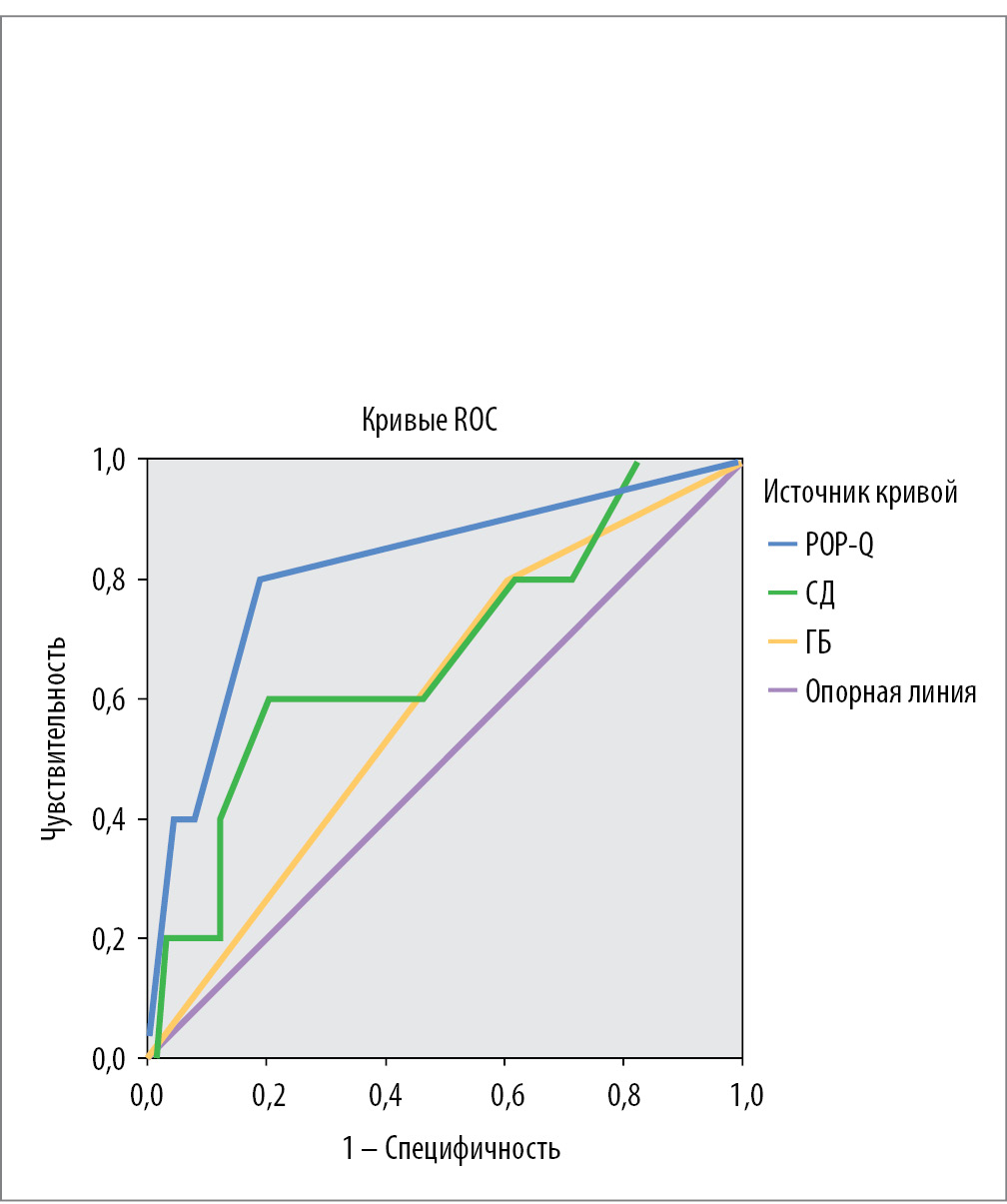 Results. Analysis of extragenital diseases in women included in the study showed a high prevalence in the experimental group of hypertension (p=0.028), osteochondrosis (p=0.001), scoliosis (p=0.028), hemorrhoids (p=0.013). Also, women in this group more often noted stretch marks on the skin (p=0.002) and were more often operated on for other diseases (p=0.043), which indicates the association of genital prolapse with undifferentiated connective tissue dysplasia and hypertension. The diagnosed “severe osteoporosis” (according to 1 or more densitometry indicators, where the T-score is less than -2.5) had a direct correlation with the duration of menopause. For a detailed analysis of the factors influencing severe osteoporosis in peri- and postmenopausal women, logistic regression analysis and ROC analysis were performed. The independent variable was the presence of severe osteoporosis, and the dependent variables were: stage according to POP-Q, the presence of hypertension, the presence of diabetes mellitus in history.