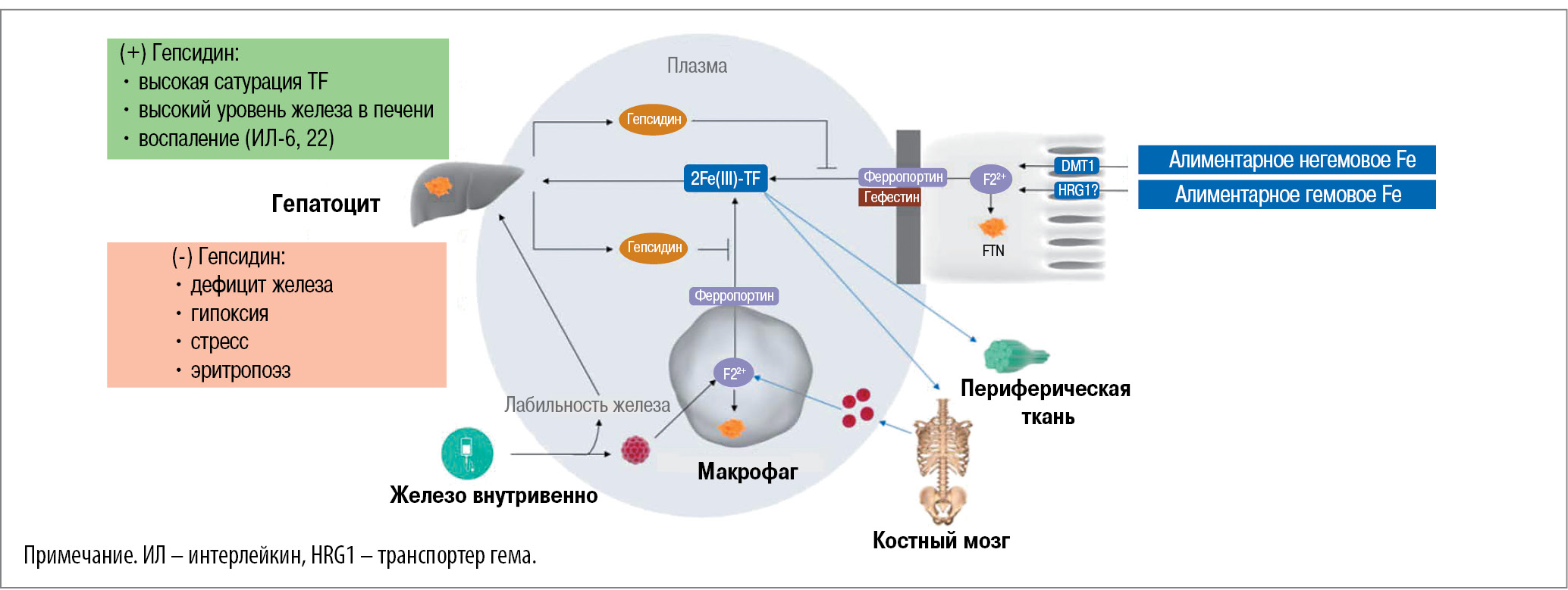 В геноме человека представлены по крайней мере 27 генов, отвечающих за транспорт и гомеостаз железа [2]. Схематично обмен железа в организме представлен на рис. 1.