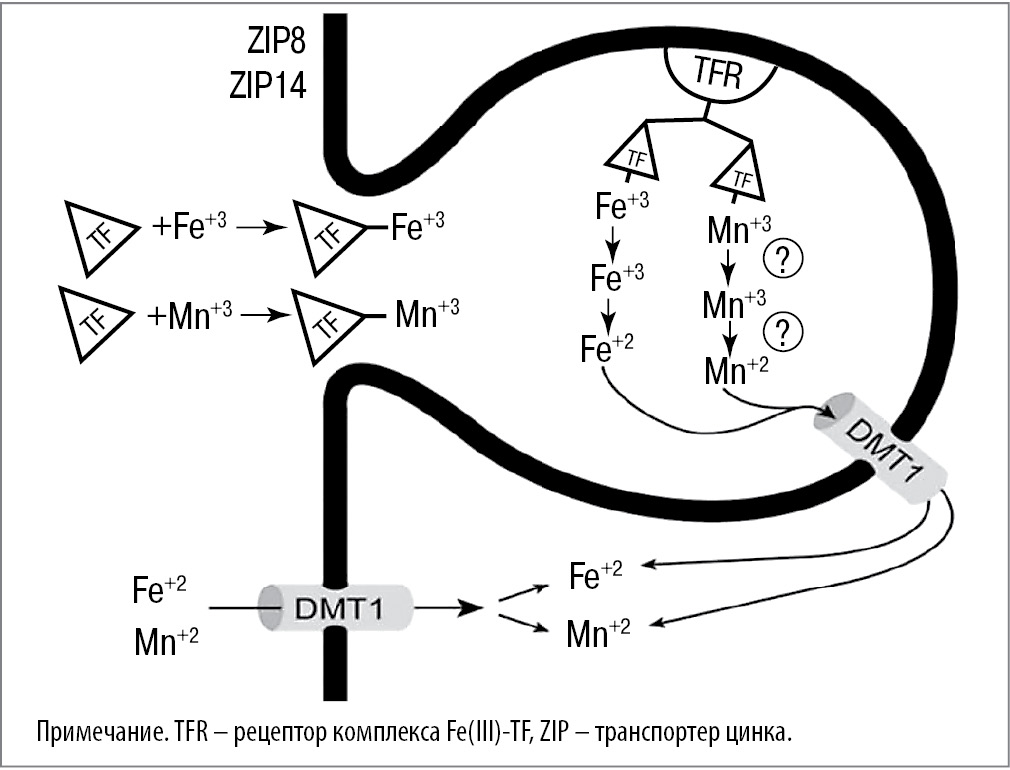 Рассмотрим причины отмеченной сравнительно низкой абсорбции Fe(III) (см. табл. 2). В желудочно-кишечном тракте (ЖКТ) восстановление Fe(III) в Fe(II) с помощью DcytB ограничено областью двенадцатиперстной кишки [19]. Вследствие этого всасывание железа происходит в основном в двенадцатиперстной кишке (и верхних отделах тощей кишки). Fe(III), не успевшее конвертироваться в Fe(II), в дальнейшем может усваиваться только в комплексе с TF (рис. 3) [20].