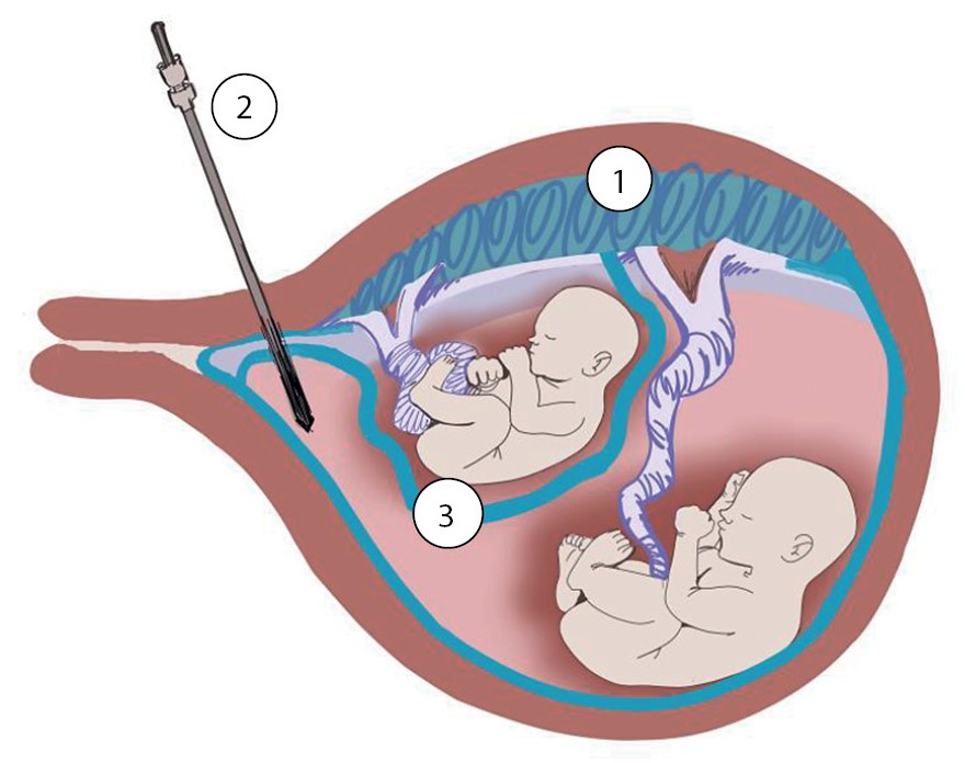 Note: 1 – anterior location of the placenta; 2 – trocar/introducer; 3 – intertwin membrane.