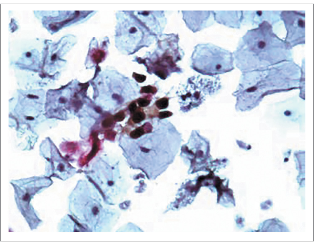 Рис. 1. Коэкспрессия p16/Ki-67. CINtec PLUS positive. Sure Path, HSIL, ×200. ВПЧ-16.