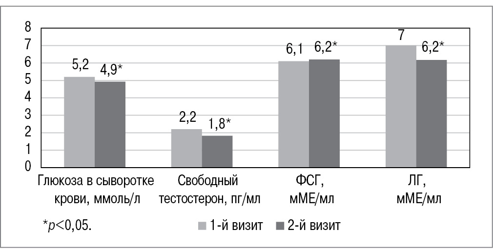 При первичном обследовании андрогенного статуса установили, что средний уровень свободного тестостерона равен 2,20 (±2,09) пг/л. Уровни же ФСГ и ЛГ в среднем составляли 6,10±7,68 и 7±5,1 мМЕ/мл соответственно.