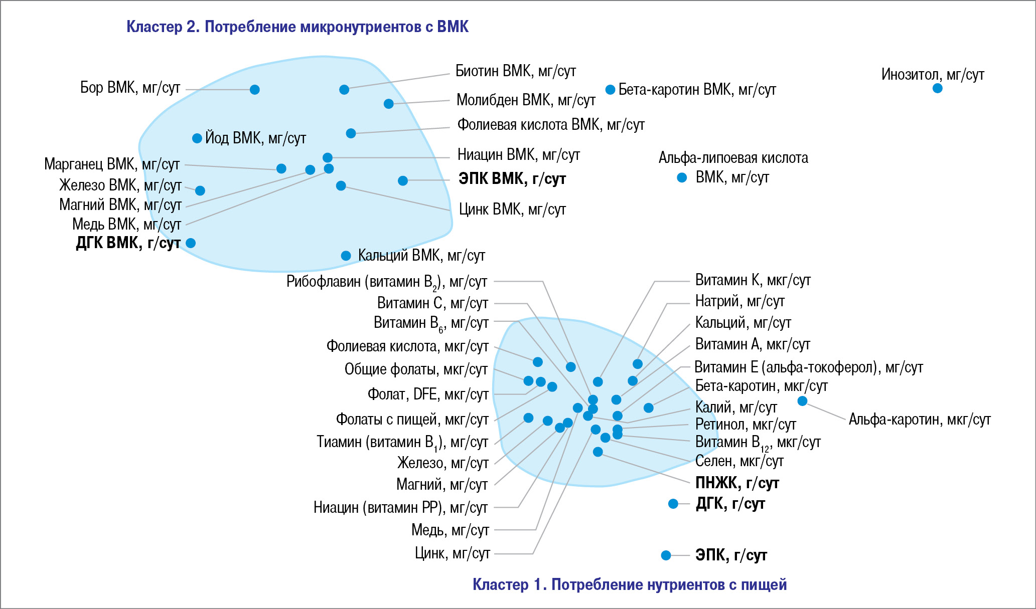 Из метрической карты на рис. 1 очевидно, что показатели потребления микронутриентов с пищей и с витаминно- минеральными комплексами (ВМК) формируют два компактных, отделенных друг от друга кластера. Иначе говоря, показатели потребления микронутриентов с пищей в большей степени коррелируют друг с другом, чем с показателями потребления микронутриентов с ВМК (что вполне ожидаемо).